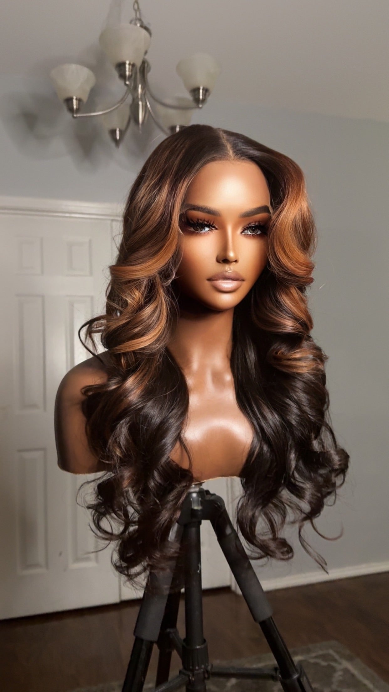 "CIARA" Wand Curled Cambodian Deep Layered 2 tone Brown Highlight Lace Wig