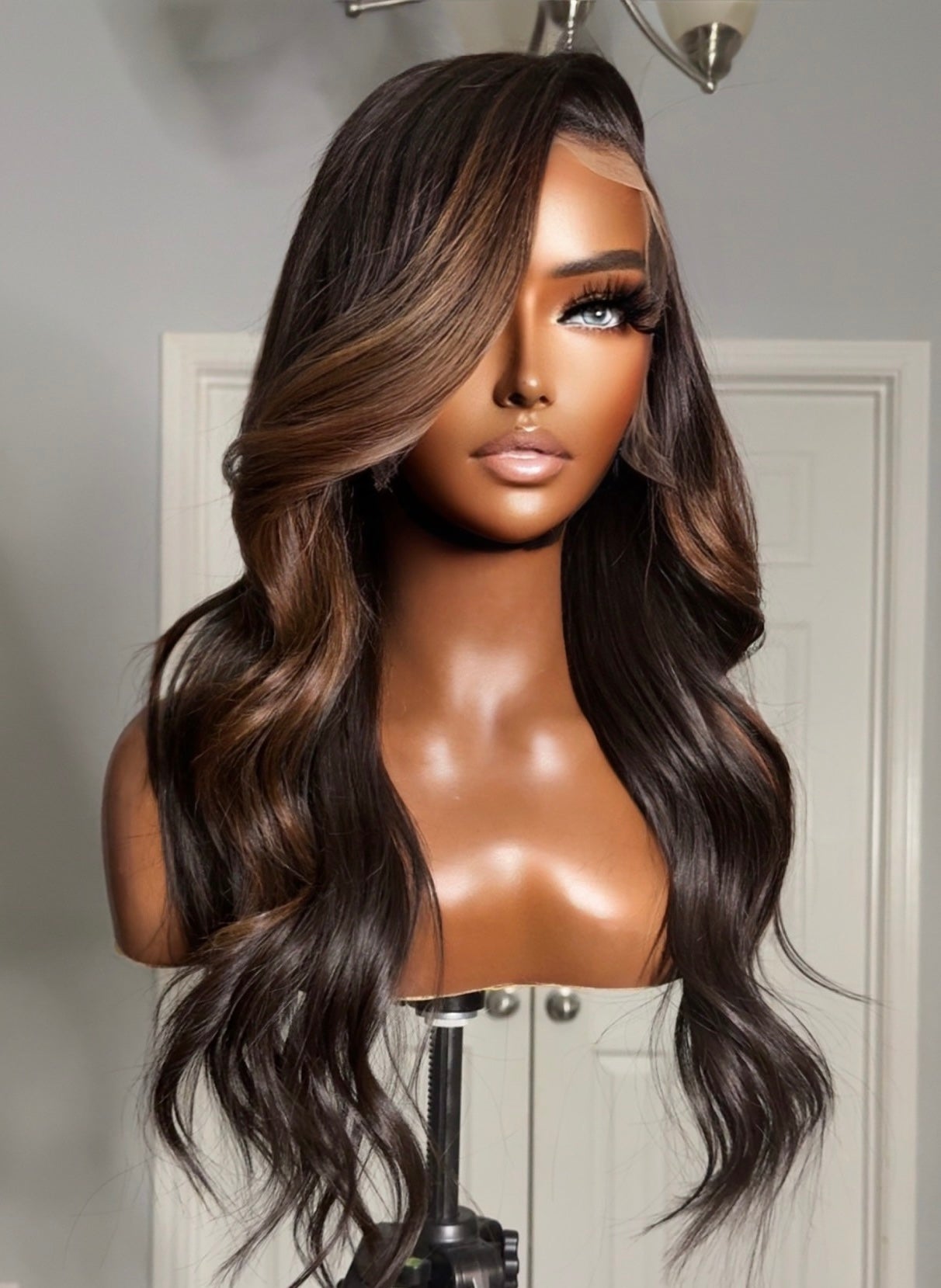Introducing the "Naomi" Brown Ombre Lux Custom Raw Indian GLUELESS HD Wig—a refined choice for discerning clients. Features authentic raw Indian hair with a captivating brown ombre finish that exudes elegance. The innovative glueless construction eliminates adhesive hassles. Advanced HD lace technology delivers an imperceptible hairline that rivals natural growth. Fully customizable to your specifications, this wig represents the pinnacle of quality, comfort, and aesthetic sophistication for the modern woman seeking transformative luxury.
